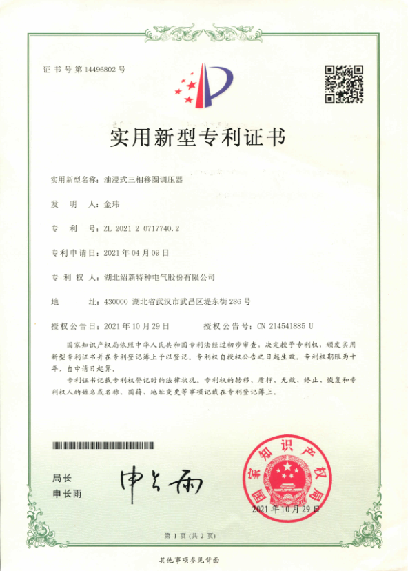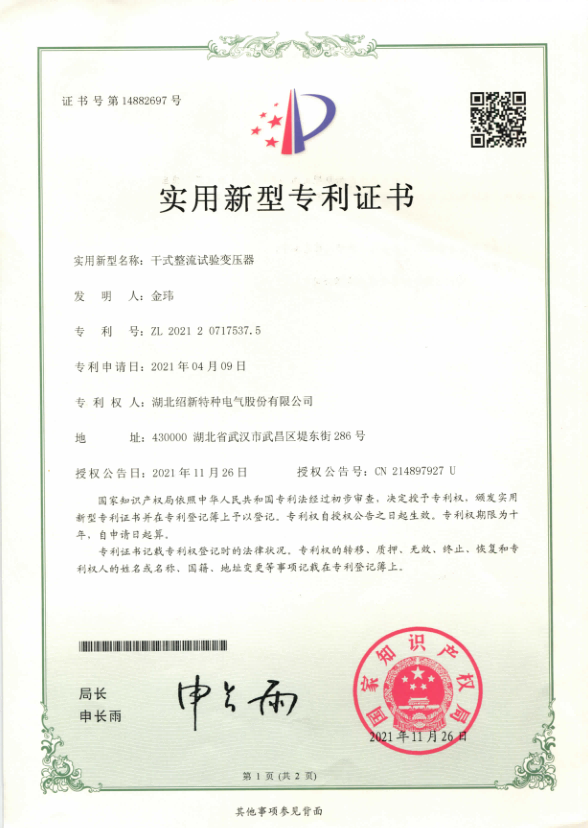 我公司擁有自主研發的多項專利技術。其中電氣試驗設備類專利四項,變壓器類制造專利三項,調壓器制造專利兩項,電阻柜專利一項,以此為核心技術開發出多種新產品。